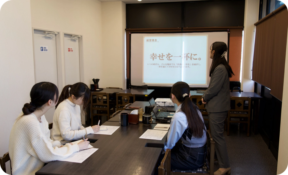 お客様として感じたことを、自分の言葉で 伝え合う時間。それぞれの気づきをもとに、 “より良いお店”を考えます。